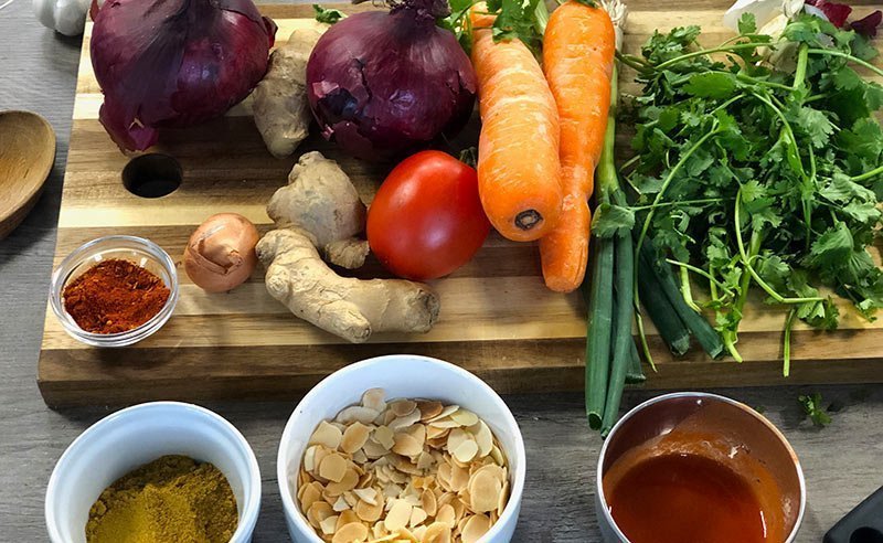 - Heat the oil in a small sauce pan, add onion, garlic and spices, fry for a couple of minutes, add carrot, fry for additional two minutes. Pour in the veg stock, boil for about 20 minutes, season well and finish with coconut cream.